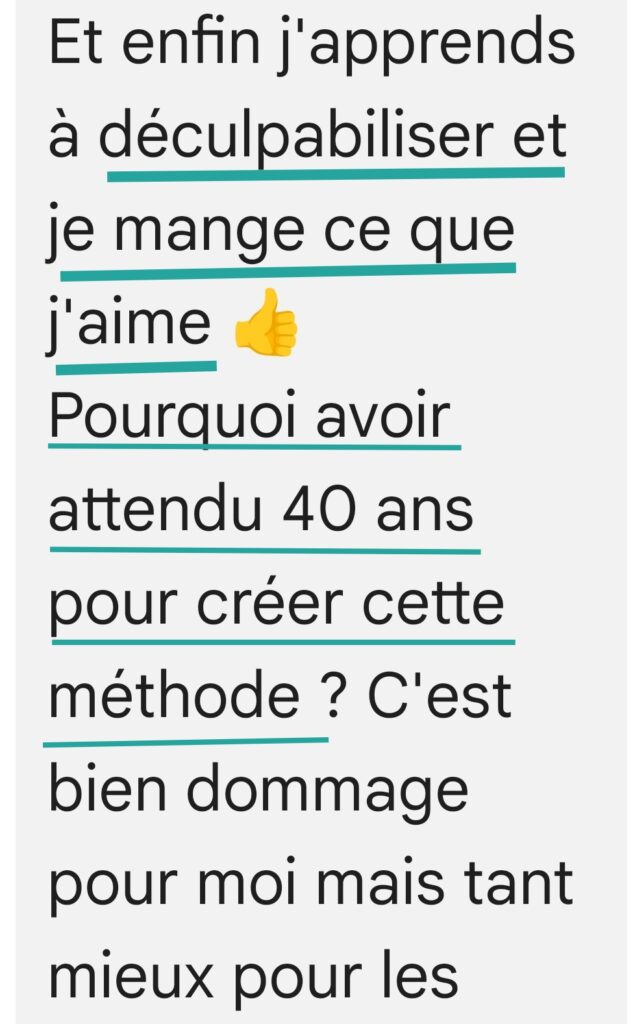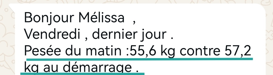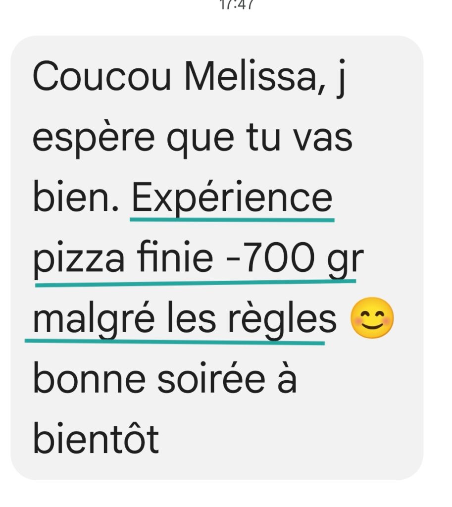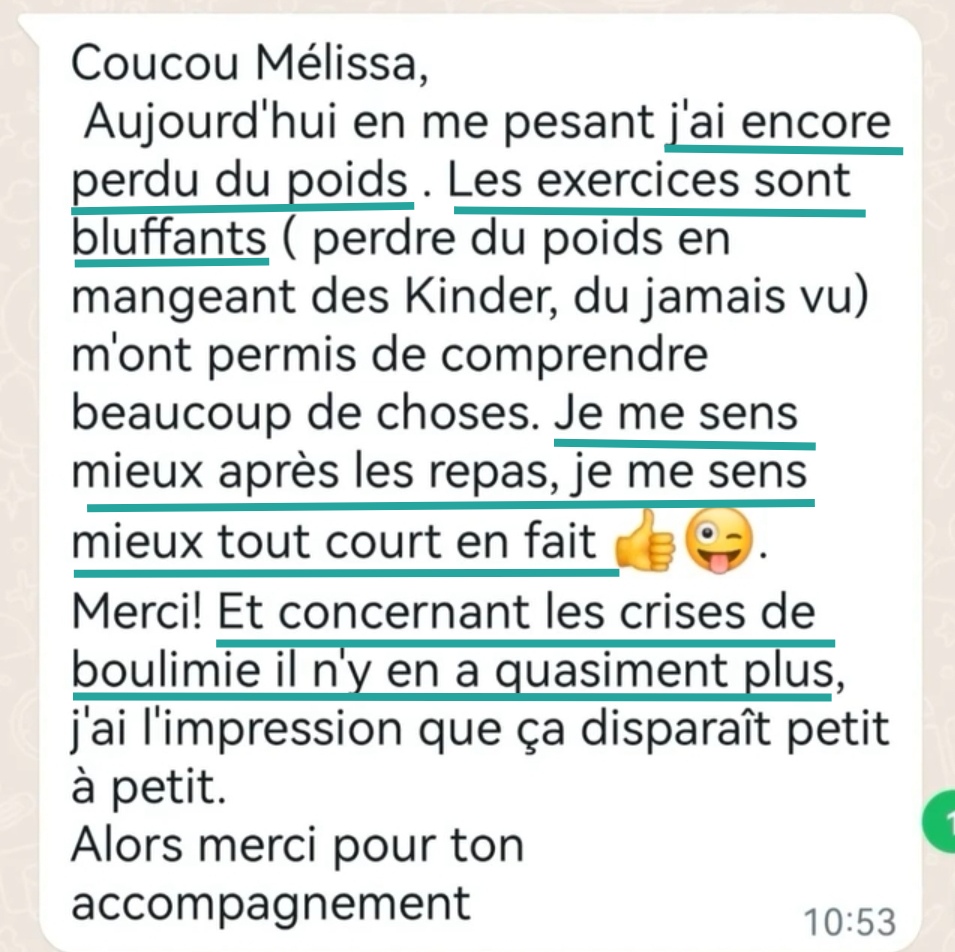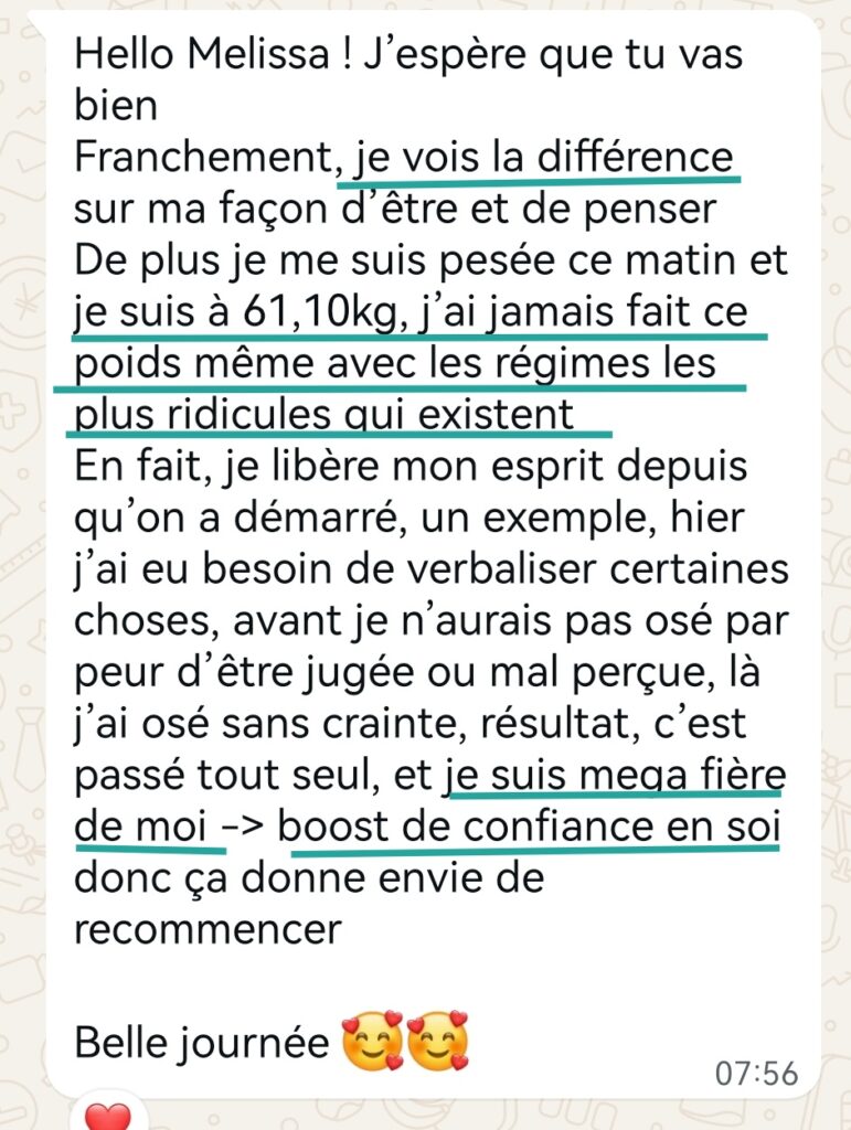J'aurais mis plusieurs mois avant d'écrire en toute connaissance de cause! Cet accompagnement (coaching) est bien plus que ce a quoi vous vous attendez ! Vous allez pleurer, mais vous allez aussi sourire et même rire. Melissa est une magnifique personne pleine de bienveillance et d'authenticité. Elle va être un guide de connaissances, un relai, un soutien de dingue! Vous allez vous rendre compte d'évidences pas si évidentes ! La perte de poids oui, mais logique! La satiété, la faim, le cerveau, l'estomac et les émotions,... Tout y passe! Bref, si vous n'aviez pas compris, je recommande !