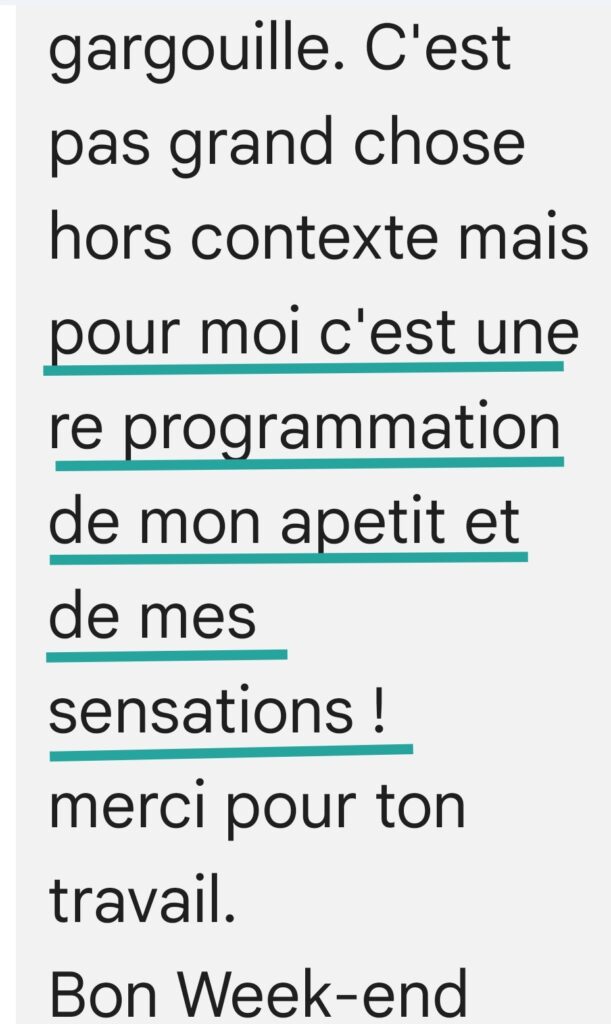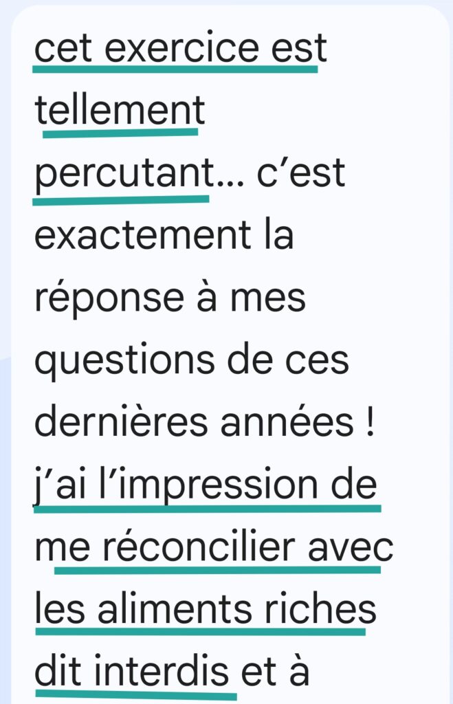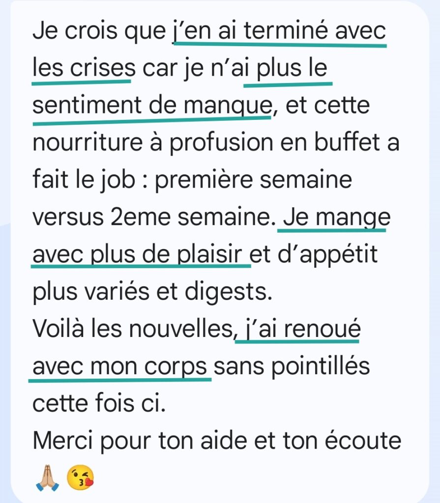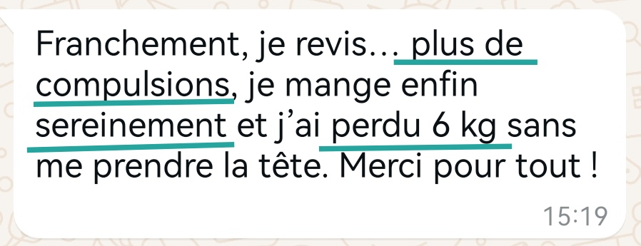 Les séances m'ont bluffées !! C'était dingue de comprendre que mon comportement avec la nourriture s'explique et qu'il existe une solution. Pour la première fois, je me suis sentie vraiment comprise. Ce n'est pas un régime qu'il me fallait, mais une réconciliation avec la nourriture. Merci pour cette libération !