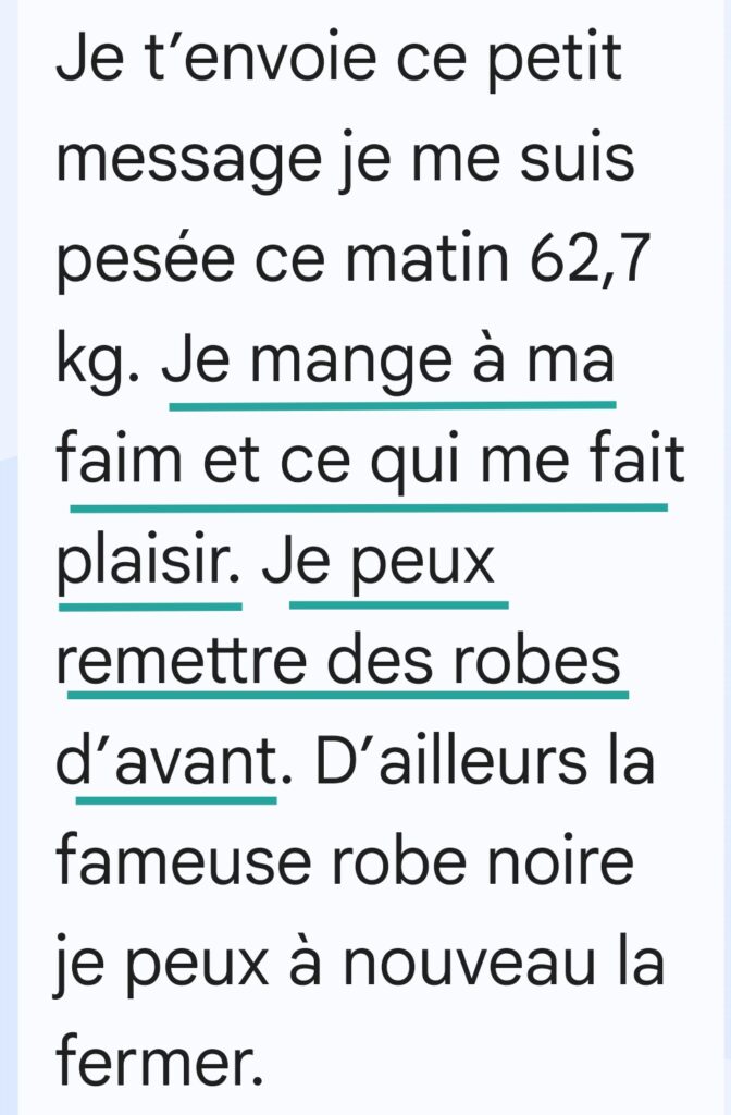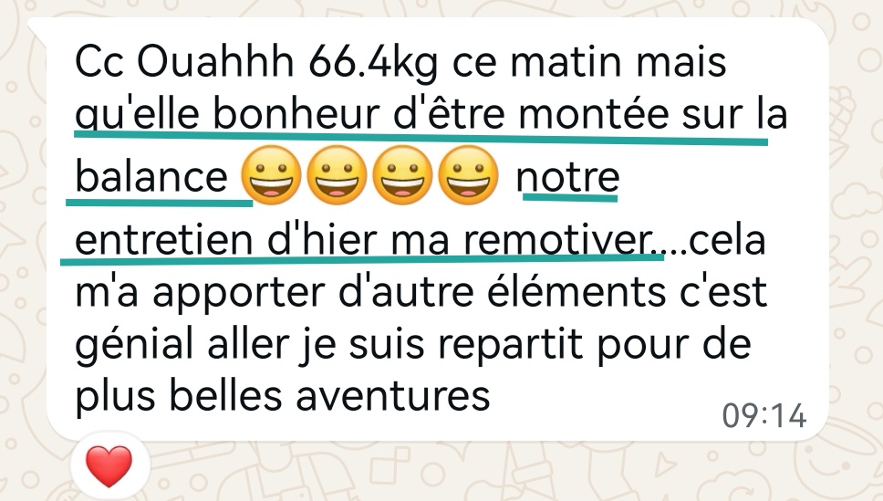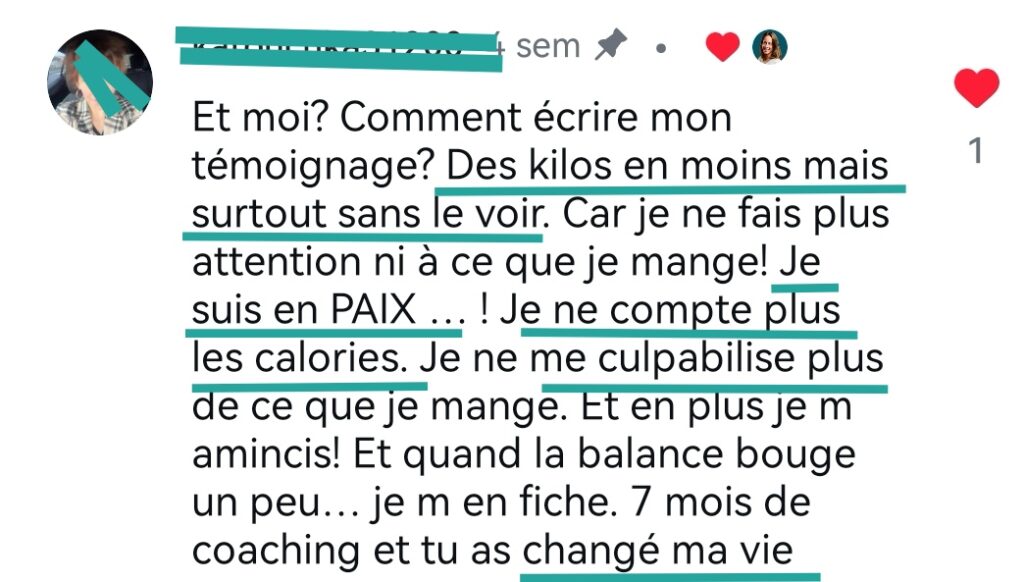 Des kilos en moins mais surtout sans le voir car je ne fais plus attention à ce que je mange ! Je suis en PAIX... ! Je ne compte plus les calories. Je ne me culpabilise plus de ce que je mange. Et en plus je mincis. Et quand la balance bouge un peu... je m'en fiche. 7 mois de coaching et tu as changé ma vie.