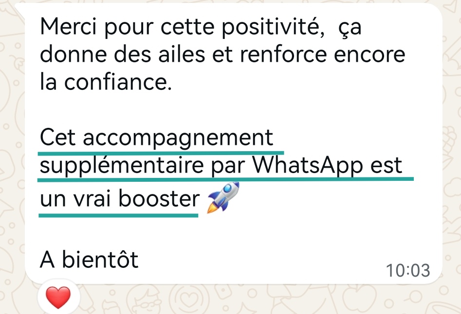 À votre initiative et au besoin, je vous suis entre les séances. Cela peut se faire par mail, SMS, WhatsApp et peut aller jusqu'à une séance intermédiaire de 30 minutes par téléphone. Vous n'êtes pas seule ! Ce service est compris dans le forfait.