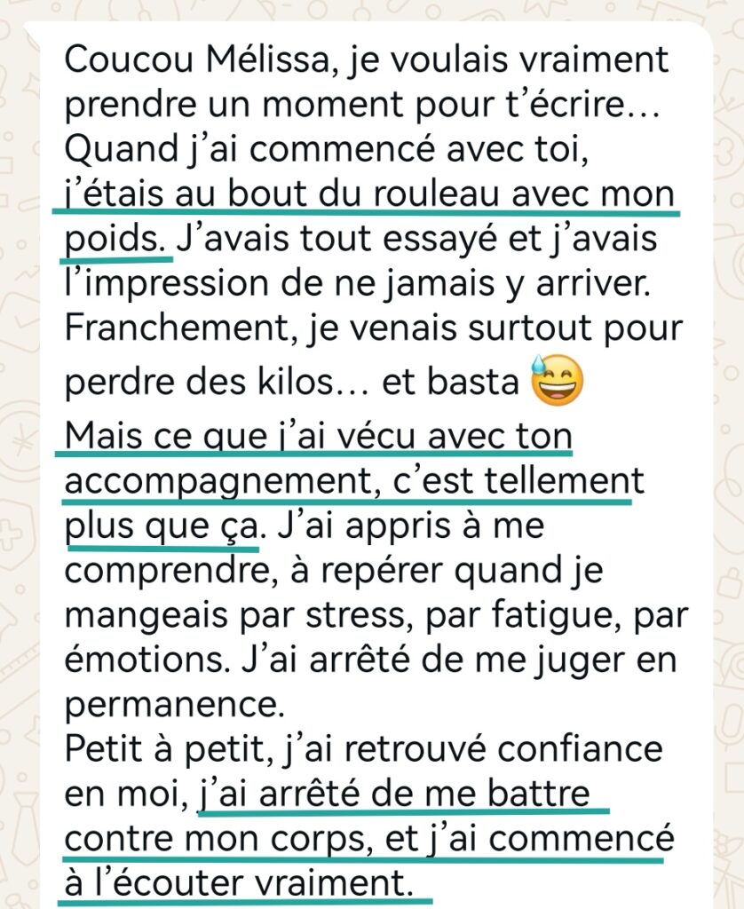 Depuis que j'ai commencé le coaching, ma façon de voir les choses a changé. Je n'avais jamais réalisé que mon souci de surpoids pouvait être lié à autre chose que mon assiette. L'accompagnement que m'offre Mélissa est exactement ce dont j'avais besoin. C'est différent de ce que j'ai pu connaître auparavant (différents régimes). Je me sens plus légère et ma culpabilité diminue de jour en jour. C'est la première fois que je passe les fêtes de Noël en profitant des repas en famille sans culpabiliser et en ayant la surprise de perdre du poids. Au départ, j'ai hésité à faire ce coaching en raison du coût. Mais quand je vois le résultat et le bien-être que ça m'apporte, je trouve que ça les vaut largement. (Sans parler de ce que j'ai déjà dépensé dans d'autres régimes qui ont été sans résultat) Si je l'avais su avant, j'aurais économisé mon argent et mon temps ! Melissa, merci infiniment pour ton écoute, ta bienveillance et ton professionnalisme.
