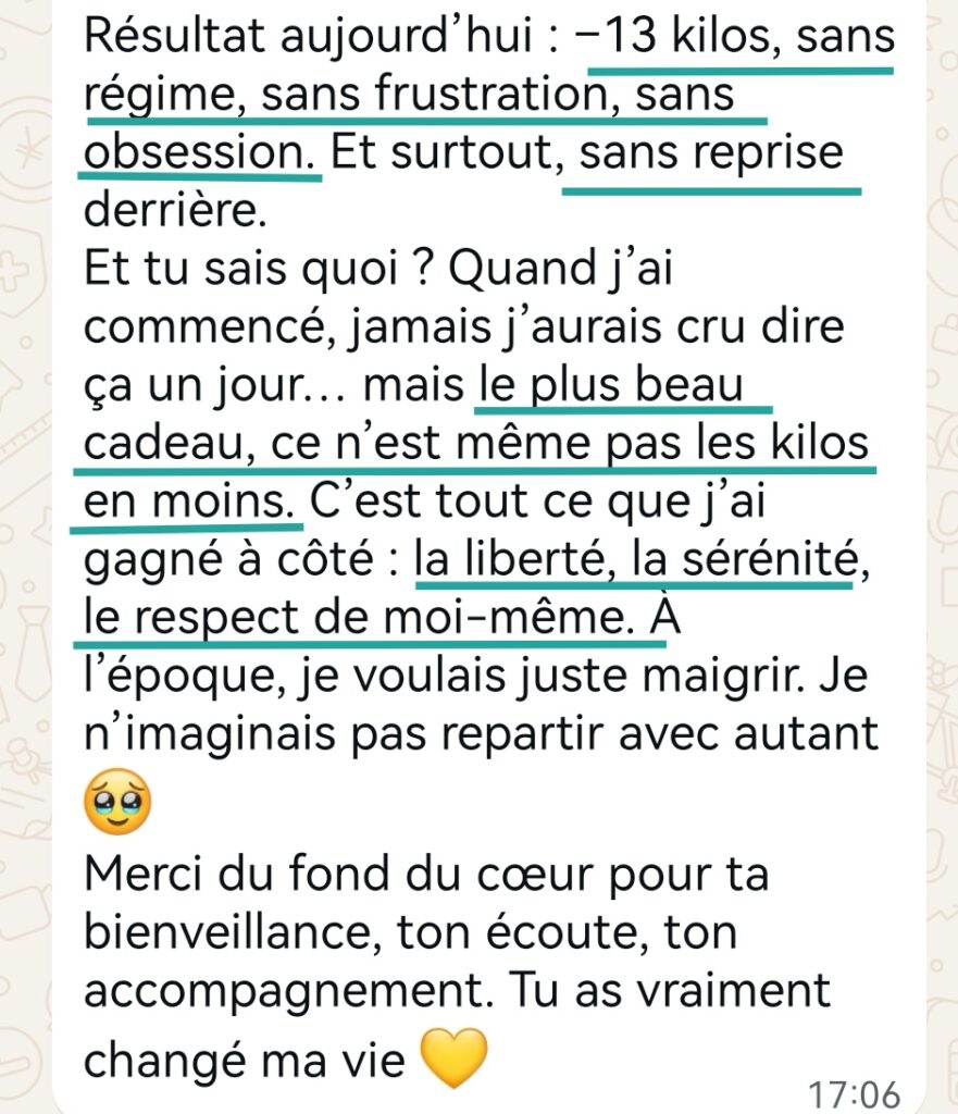 Car ce ne sont pas vos repas qu’il faut changer en premier, mais ce qui se passe dans votre tête. Tant que l’on n’a pas identifié ce qui déclenche ces comportements, ils continuent de se répéter. Comprendre vos automatismes, apaiser votre stress, apprendre à écouter vos vraies sensations : voilà le vrai chemin vers une perte de poids durable.