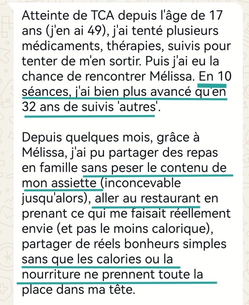 Atteinte de TCA depuis l'âge de 17 ans (j'en ai 49), j'ai tenté plusieurs médicaments, thérapies, suivis pour tenter de m'en sortir. Puis j'ai eu la chance de rencontrer Mélissa. En 10 séances, j'ai bien plus avancé qu'en 32 ans de suivis "autres". Depuis quelques mois, grâce à Mélissa, j'ai pu partager des repas en famille dans peser le contenu de mon assiette (inconcevable jusqu'alors), aller au restaurant en prenant ce qui me faisait réellement envie (et pas le moins calorique), partager de réels bonheurs simples sans que les calories ou la nourriture ne prennent toute la place dans ma tête. Je ne suis pas guérie mais j'ai pu avancer et me rendre compte que c'est possible, que je peux parvenir à vivre sans TCA et ça, c'est grâce à ma coach Mélissa.
